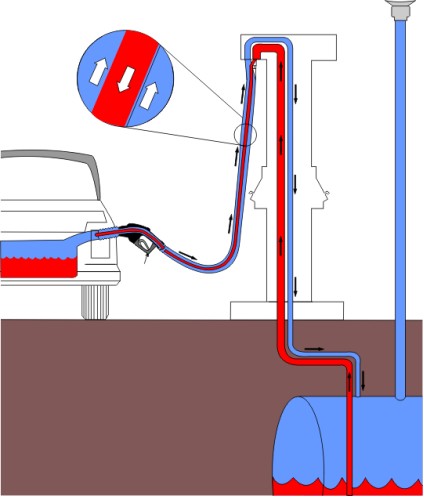 工作原理:加油槍從油罐向給車輛車輛加注汽油時,通過真空泵轉動產生一定的真空度,經過加油槍、同軸膠管、油氣分離接頭等油氣回收設備,按照1.0~1.2氣液比的要求,將加油過程中車輛油箱內揮發的油氣通過油氣回收管線收集到地下低標號汽油罐內,從而實現加油過程油氣回收。